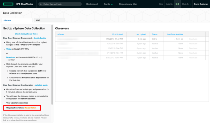 2. Existing Accounts: HPE CloudPhysics Status Page in the left hand Installation Instructions by slecting the “Reveal Token” link. (https://app.cloudphysics.com/observer-status/vsphere/token)